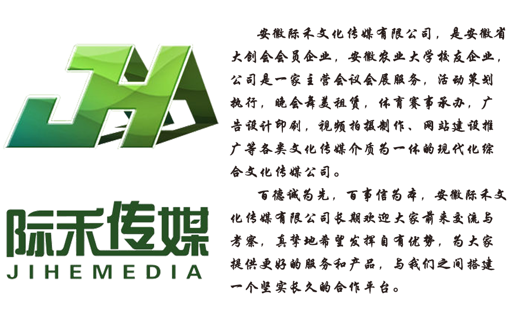 安徽際禾文化傳媒有限公司,注冊資本500萬元,安徽省科技廳認定科技型中小企業,安徽省青年企業家協會會員單位,安徽省大學生創新創業促進會理事單位,蚌埠市青年企業家協會常務理事單位,公司是一家主營會議會展服務,活動策劃執行,晚會舞美租賃,體育賽事承辦,廣告設計印刷,視頻拍攝制作、網站建設推廣等各類文化傳媒介質為一體的現代化綜合文化傳媒公司。百德誠為先,百事信為本,安徽際禾文化傳媒有限公司長期歡迎大家前來交流與考察,真摯地希望發揮自有優勢,為大家提供更好...